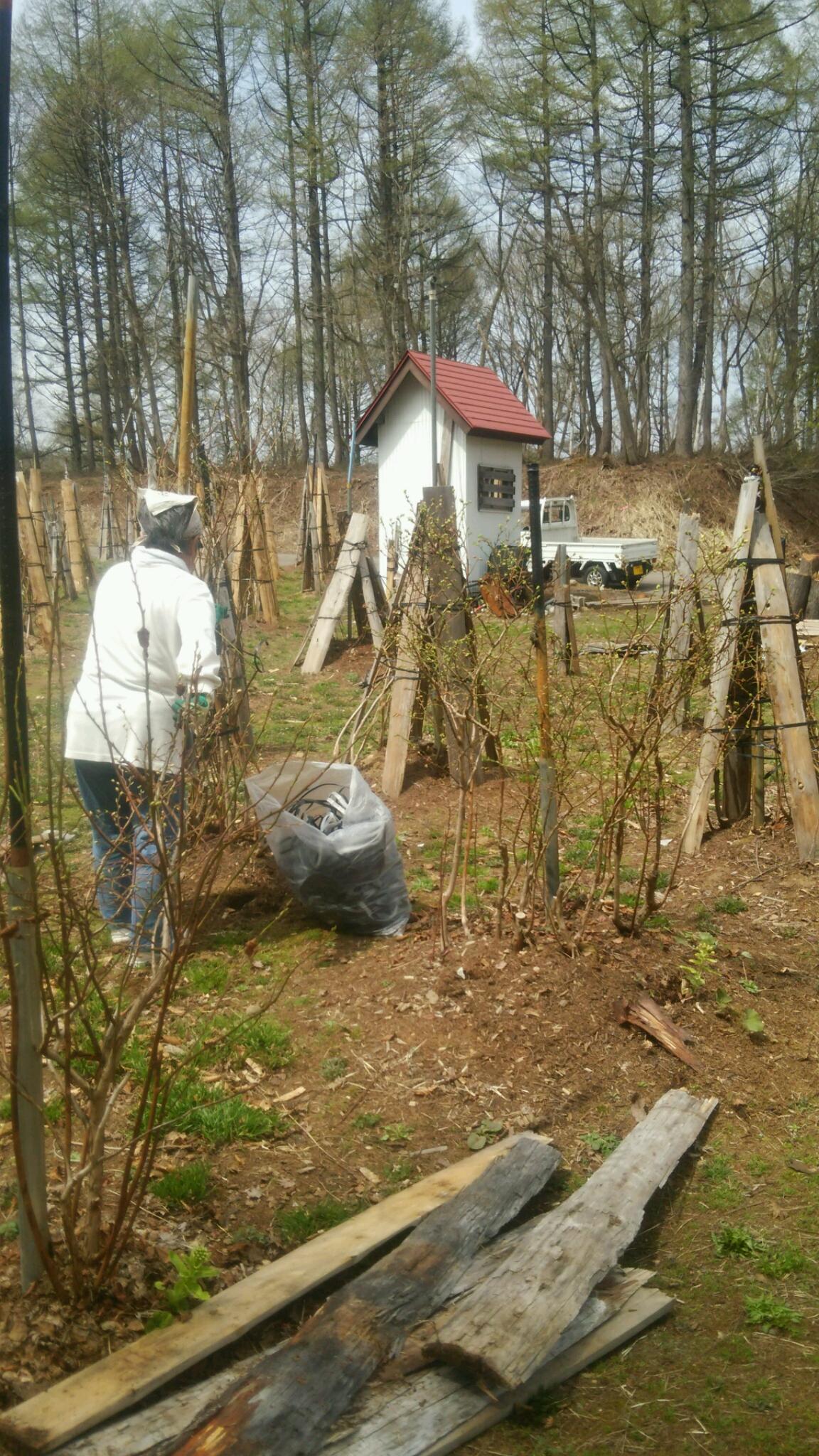 【斑尾高原】ブルーベリーの雪囲いを外し始めました。