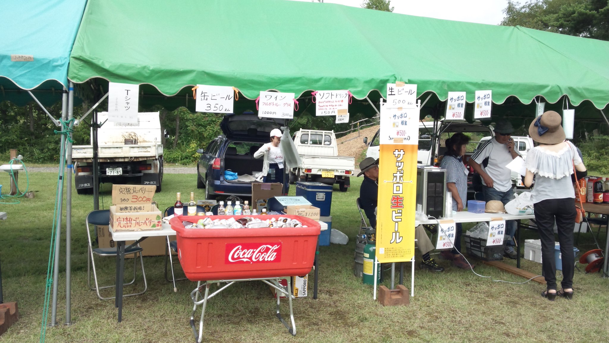焼きそば、イワナの塩焼き、生ビール、缶ビール、ワインにソフトドリンク、オリジナルTシャツ、そして珍しい日本蜜蜂の蜂蜜!そしてそしてうちの生ブルーベリー!