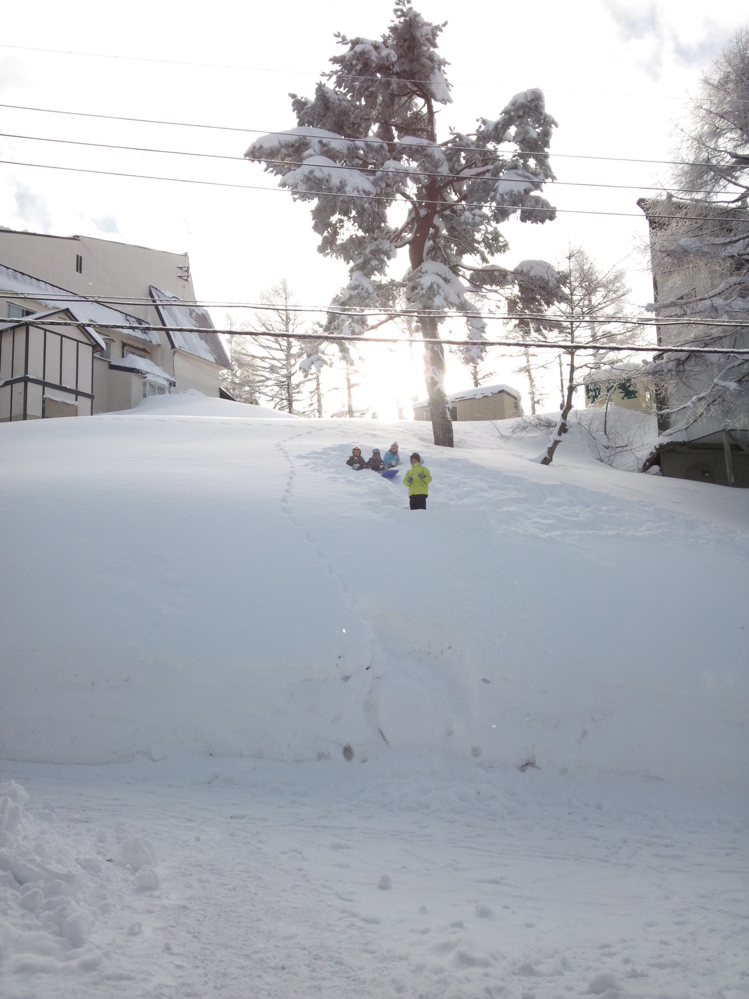 今日チェックアウトのお客様の子供さんたち、表の雪壁をヨイショヨイショとよじ登り、とうとうこんな上まで行っちゃいました(v^ー°)