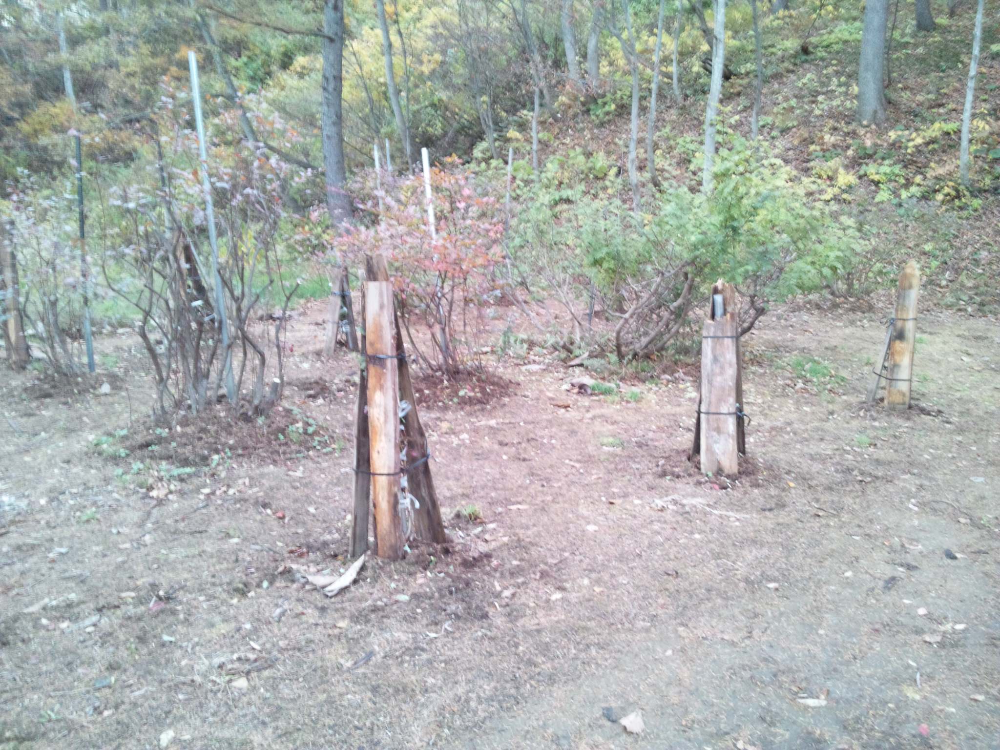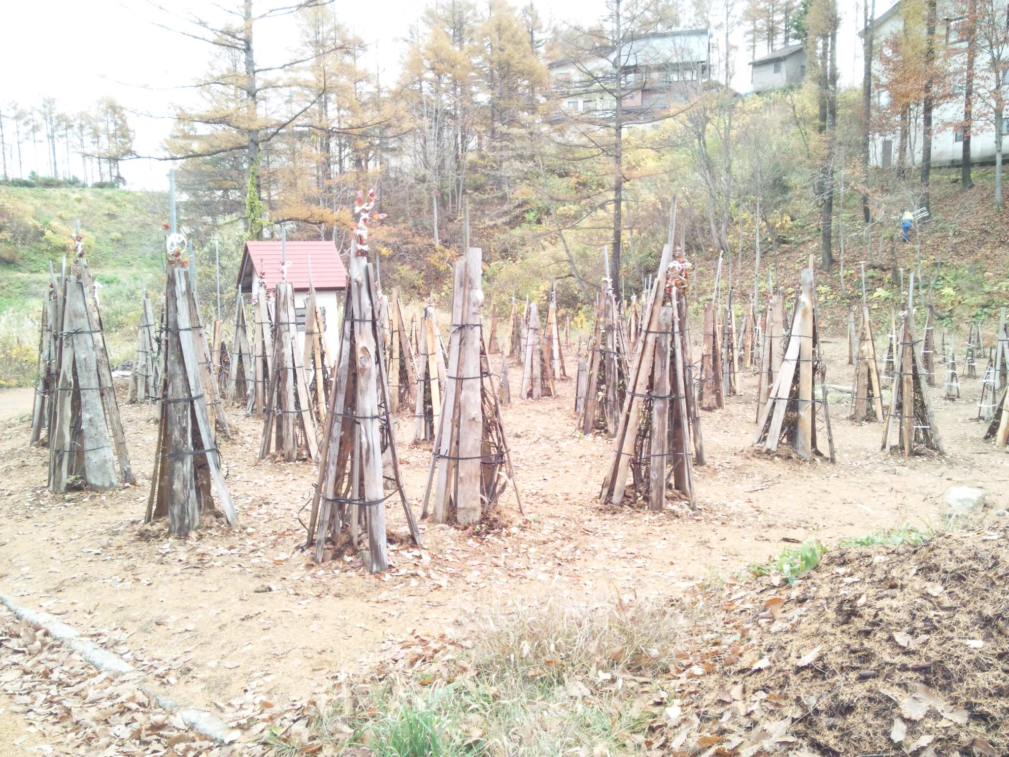 今年はたくさん剪定したので大きな樹が少なく大分やり易くなってましたが、逆に小さかった樹が大きくなり中途半端な高さで(笑)中くらいの長さの、囲う板を確保するのが大変でした。